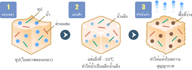 กระบวนการถนอมอาหารด้วยเทคโนโลยีฟรีซดรายมีคุณลักษณะเด่น ดังนี้