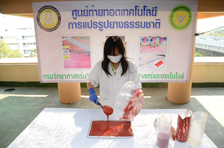 นอกจากนี้ กรมวิทยาศาสตร์บริการ ได้มีการถ่ายทอดเทคโนโลยีการแปรรูปยางธรรมชาติในการสร้างพื้นลู่-ลานกรีฑา สนามกีฬา และลานอเนกประสงค์ โดยใช้ยางธรรมชาติเป็นวัตถุดิบในการผลิตเม็ดยาง เพื่อให้ได้ผลิตภัณฑ์ที่มีคุณภาพ และสามารถนำไปใช้ประโยชน์ในด้านต่างๆ ที่เกี่ยวข้องกับอุตสาหกรรมยาง และอุตสาหกรรมก่อสร้าง ซึ่งถือเป็นอีกแนวทางหนึ่งที่ช่วยเพิ่มมูลค่าให้กับผลผลิตทางการเกษตร และลดค่าใช้จ่ายในนำเข้าวัสดุจากต่างประเทศ