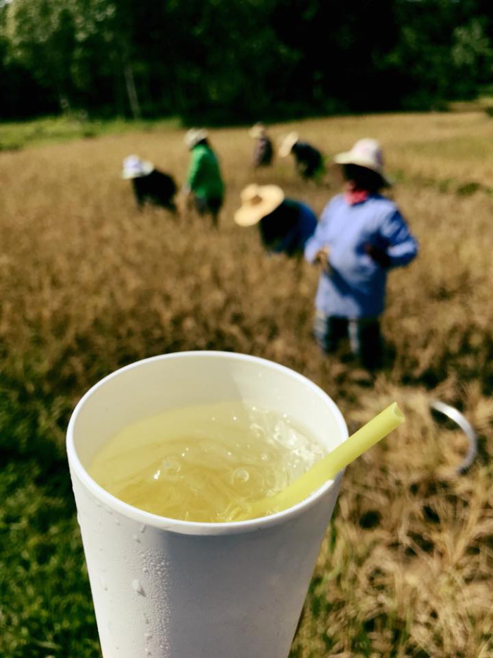 7. หลอดดูดน้ำจากซังข้าว หลอดดูดน้ำชนิดนี้ถือเป็นผลพลอยได้จากการทำนา ในขั้นตอนของการเก็บเกี่ยว โดยการใช้หลอดดูดน้ำจากซังข้าวเป็นการช่วยลดขยะที่มีโอกาสลงไปสู่ท้องทะเลได้ดี ดังเช่นตัวอย่างของชุมชนเกาะยาวใหญ่ที่ผู้คนในเกาะปลูกข้าวไว้ทานเอง