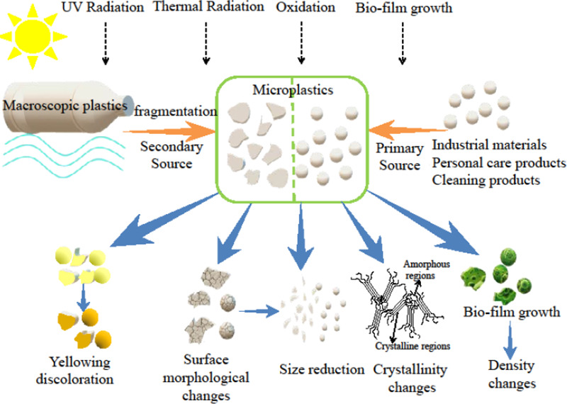 2. Secondary microplastics เป็นพลาสติกที่เกิดจากพลาสติกที่มีขนาดใหญ่ หรือมาโครพลาสติก (Macroplastic) ซึ่งสะสมอยู่ในสิ่งแวดล้อมเป็นเวลานานเกิดการย่อยสลายหรือแตกหัก โดยกระบวนการย่อยสลายพลาสติกขนาดใหญ่ให้กลายเป็นพลาสติกขนาดเล็กนี้สามารถเกิดได้ทั้งกระบวนการย่อยสลายทางกล (Mechanical degradation) กระบวนการย่อยสลายทางเคมี (Chemical degradation) กระบวนการย่อยสลายทางชีวภาพ (Biological degradation) และกระบวนการย่อยสลายด้วยแสงอาทิตย์ ((UV degradation) ซึ่งกระบวนการเหล่านี้จะทำให้สารแต่งเติมในพลาสติกหลุดออก ส่งผลให้โครงสร้างของพลาสติกเกิดการแตกตัวจนมีขนาดเล็ก กลายเป็นสารแขวนลอยปะปนอยู่ในแม่น้ำและทะเล
